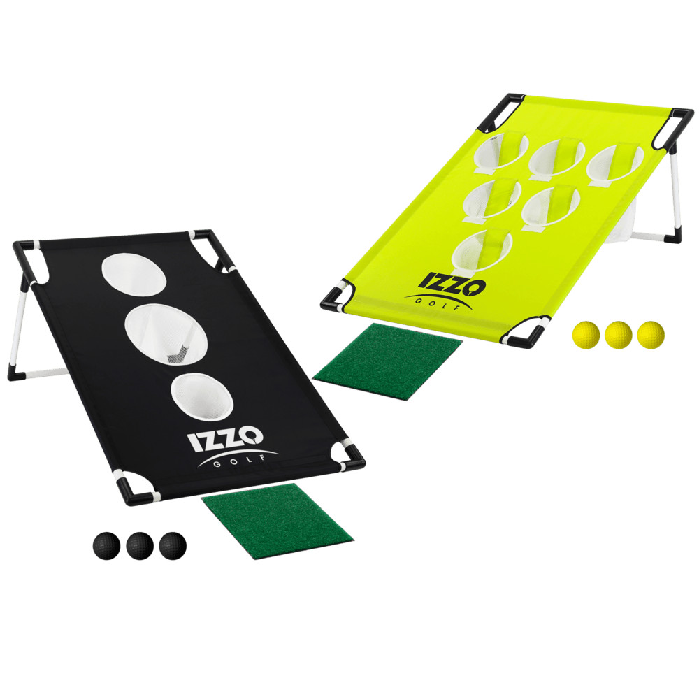 The Izzo Pong-Hole Chipping Game is the ultimate in versatility & fun. Great for short game practice or back yard play. Easily transportable in a lightweight carry bag, bring this game to the beach, course, camping, anywhere! Includes (2) sets of interchangeable game covers and (2) hitting mats, (6) soft flight, foam practice balls, ground stakes and nylon carry bag. The Pong game covers feature closure tabs to record made shots. Just grab a couple wedges and get out there and play!