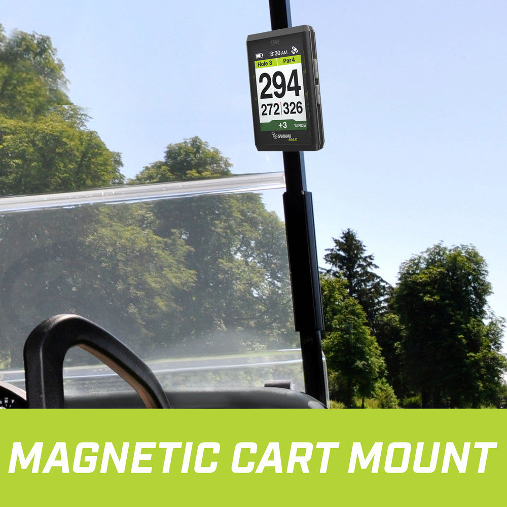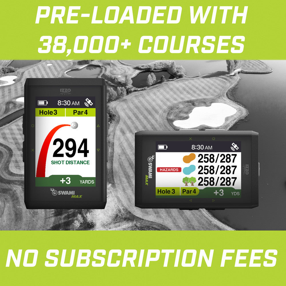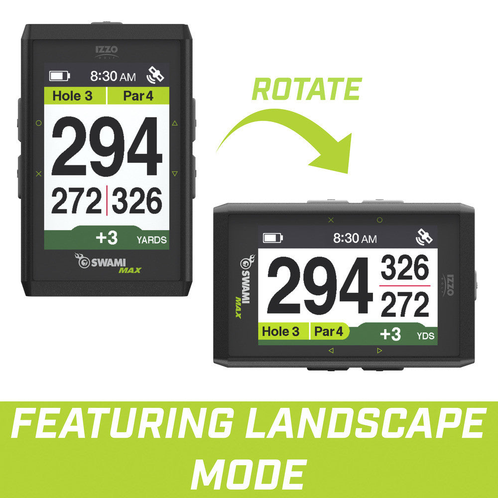 The Izzo Swami Max Golf GPS features a unique, extra-large 3.5 inch high res LCD color display that can be oriented vertically or horizontally to meet your visual preference. The Swami MAX is preloaded with 38,000 global course maps with no subscription or update fees and will auto-recognize your course at start-up. The MAX provides accurate distances to the Front, Center and Back of the green, as well as layup and carry distances to hazards and doglegs. Other useful features include auto-hole advance, shot distance measurement and a digital scorecard, as well as a very strong, integrated magnet allowing you to securely affix the unit to your riding cart frame for ultra-convenient hands-free access throughout your round. This Izzo Golf Swami MAX GPS includes a rechargeable lithium ion battery that lasts up to 16 hours on a full charge.